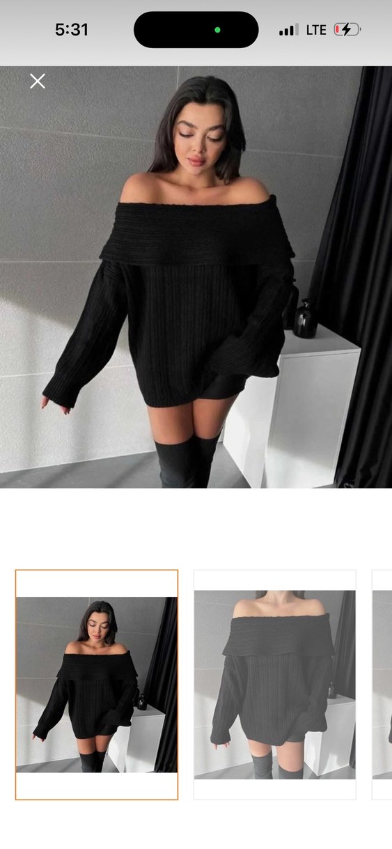 Siyah, örgü kadın kazak, bol kesim, uzun kollu ve kayık madonna yakaya sahiptir. Yumuşak sentetik kumaştan yapılmıştır, günlük kullanım için uygundur. 2-3 kere giydim L-M bedene uygun