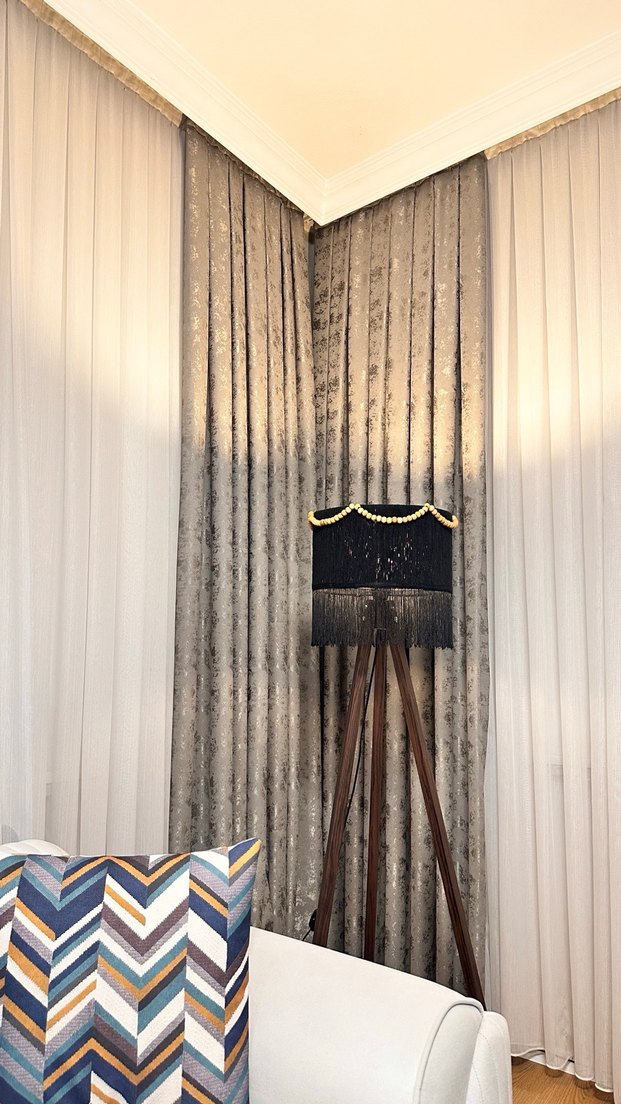 Siyah Siyah lambader, siyah renk püsküllü,ahşap boncuklu abajuruyla birlikte dokulu perdeler önünde yer alır.AYAK FİYATA DAHİL DEĞİLDİR #makrome #abajur