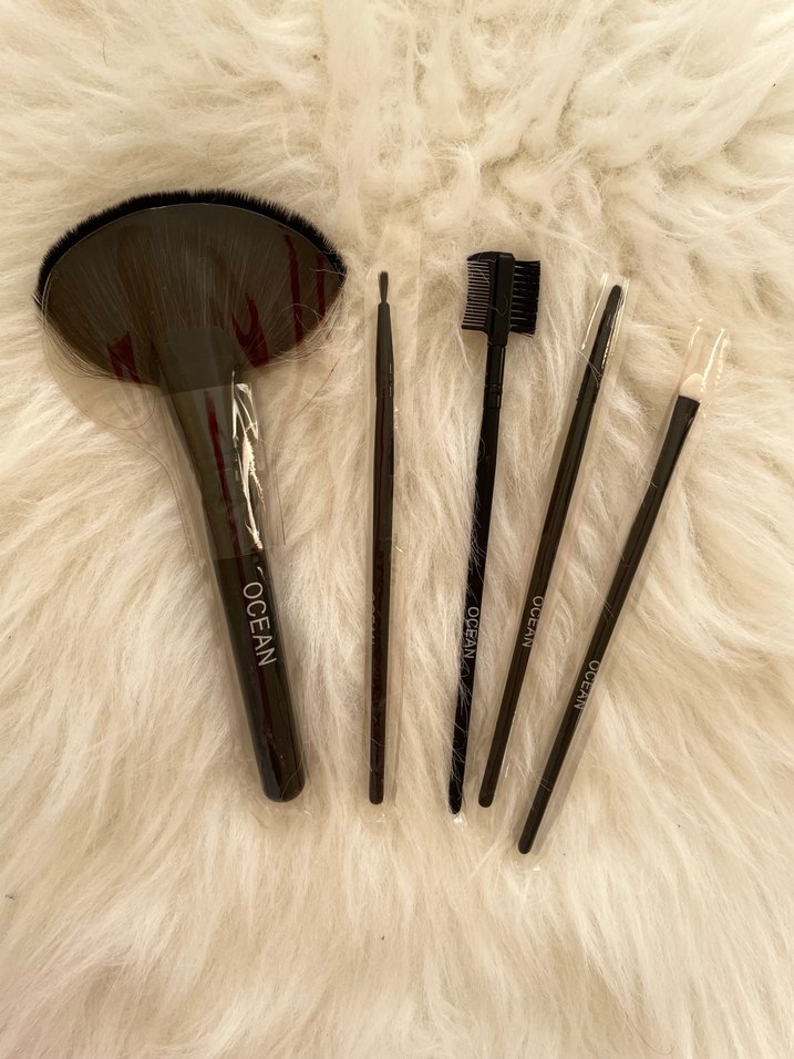 Fan fırça, detay fırçası, kaş tarağı, açılı fırça ve cımbız fırçası içeren 5 parçalı siyah makyaj fırça seti. ️