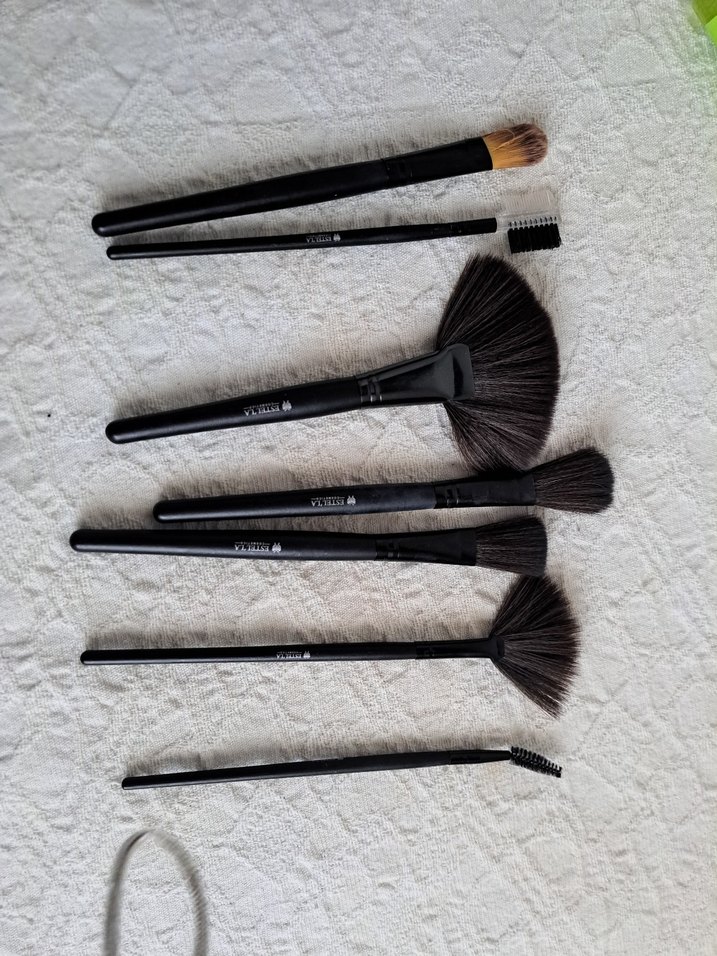 farklı makyaj uygulamaları için yelpaze ve spoolie fırçaları içeren siyah saplı makyaj fırça seti. ️
