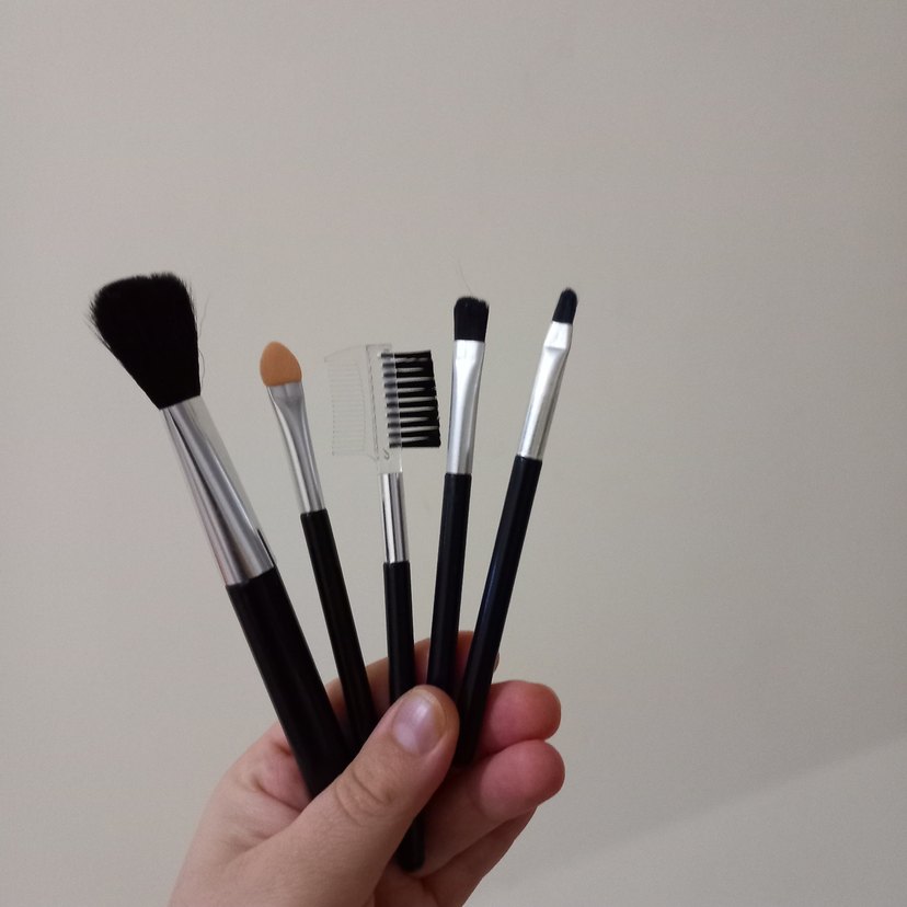 Farklı makyaj uygulamaları için çeşitli uçlara sahip beş siyah makyaj fırçası seti. Yumuşak kıllı, koyu renk saplı. ️