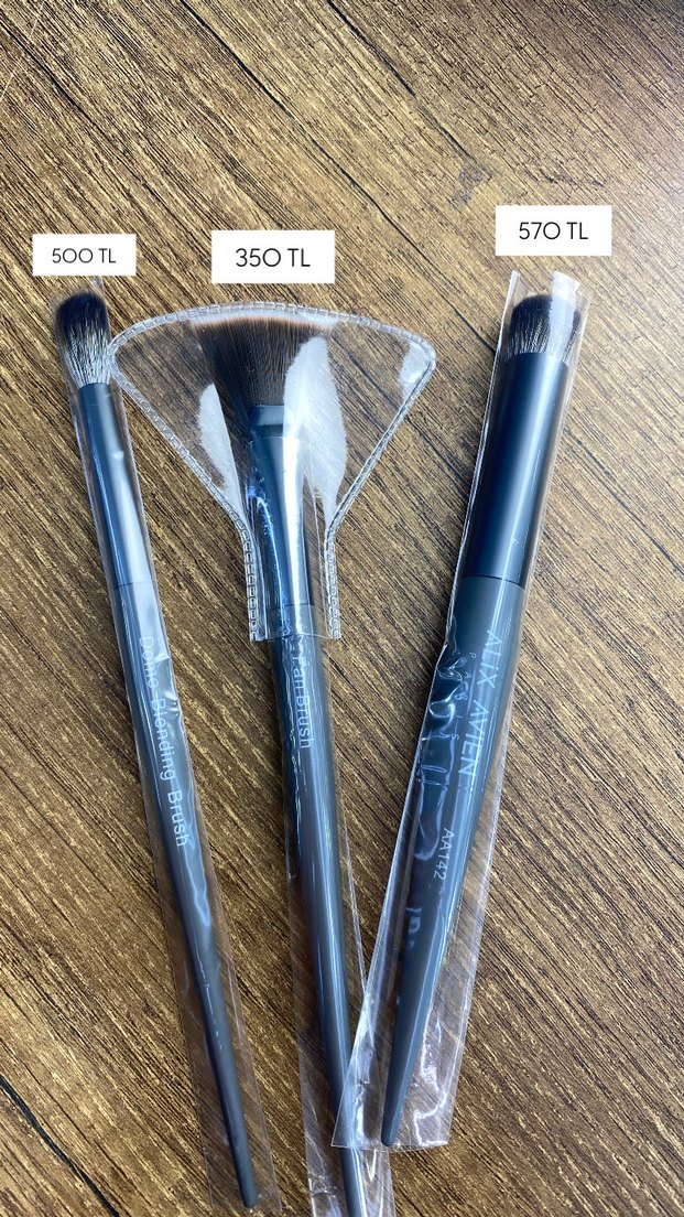 Farklı boyut ve şekillerde üç siyah makyaj fırçası seti. Fiyatları 350, 500 ve 570 TL. Hassas makyaj uygulaması için uygundur. ️