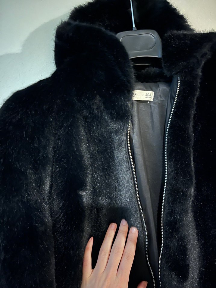 Hiç giymedim bir senedir dolabımda. Hiçbir kusuru yok. Kalça altında bitiyor. Dar kalıp. Kürkü mango kalitesi, ağır bir kürk, fermuarlı ve şapkalı, çok kaliteli. Zayıf ve uzun boylu kişilere daha çok yakışacaktır.