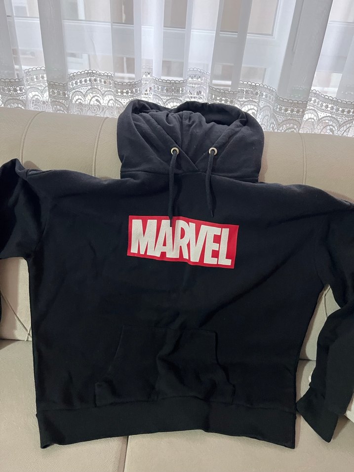 Siyah, kapüşonlu ve uzun kollu, Marvel baskılı bu fitted sweatshirt yumuşak fleece kumaştan üretilmiştir. Velcro detayı ve midi boyu ile spor şıklık sunar.
