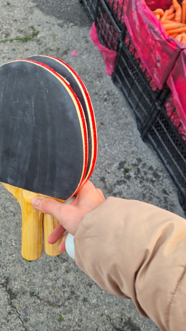 Ahşap saplı, siyah masa tenisi raketlerinden oluşan set, keyifli oyunlar için uygundur.
