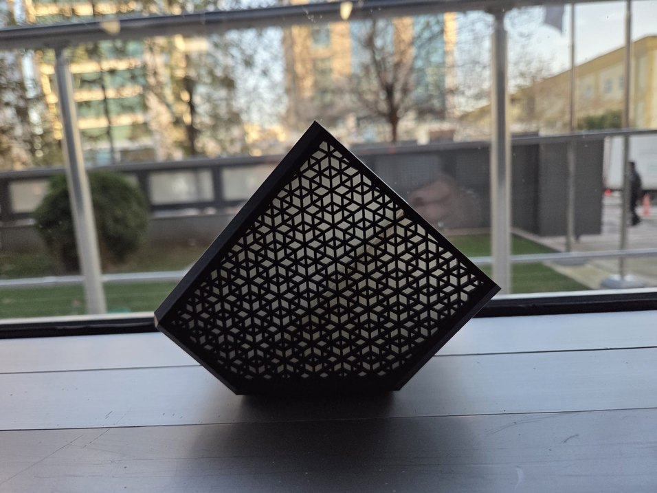 Siyah renkte, geometrik desenli ızgaraya sahip ve kompakt küp şeklinde masa üstü kalem kutusu ürünü kendimiz ürettiğimiz için etiketi bulunmuyor