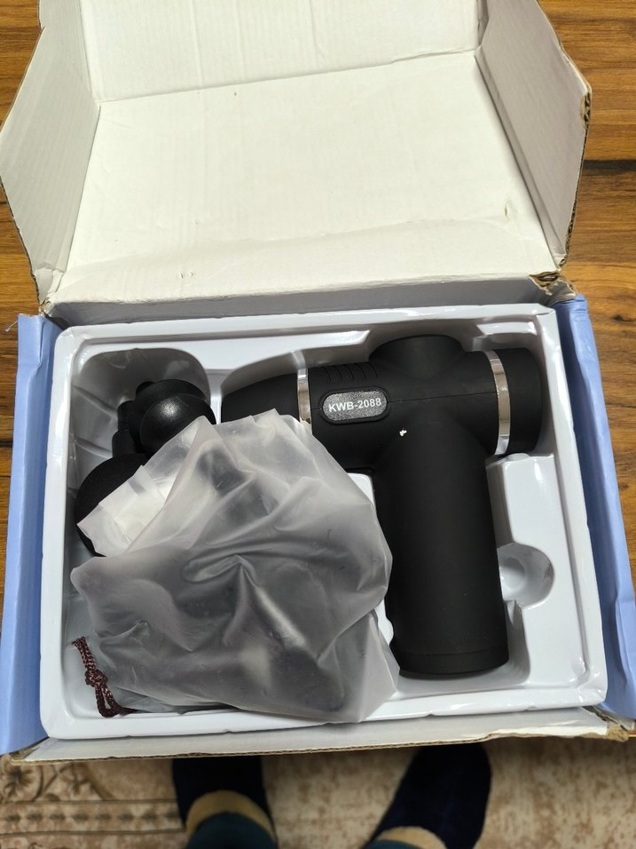KWB-2088 model siyah masaj tabancası, çeşitli başlıklarla birlikte beyaz kutuda sunulmuştur. Rahat tutuşlu ve derin doku masajı sağlar.