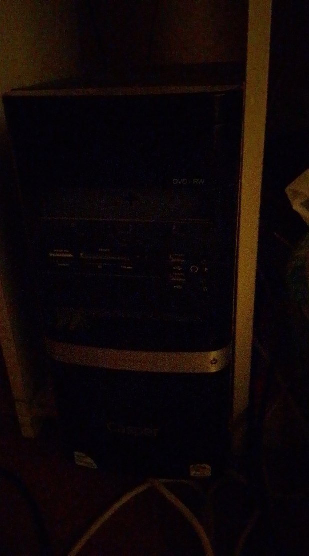 Ön yüzde DVD-RW sürücüsü ve çeşitli bağlantı noktaları bulunan siyah masaüstü bilgisayar. Genel kullanım için uygundur. ️