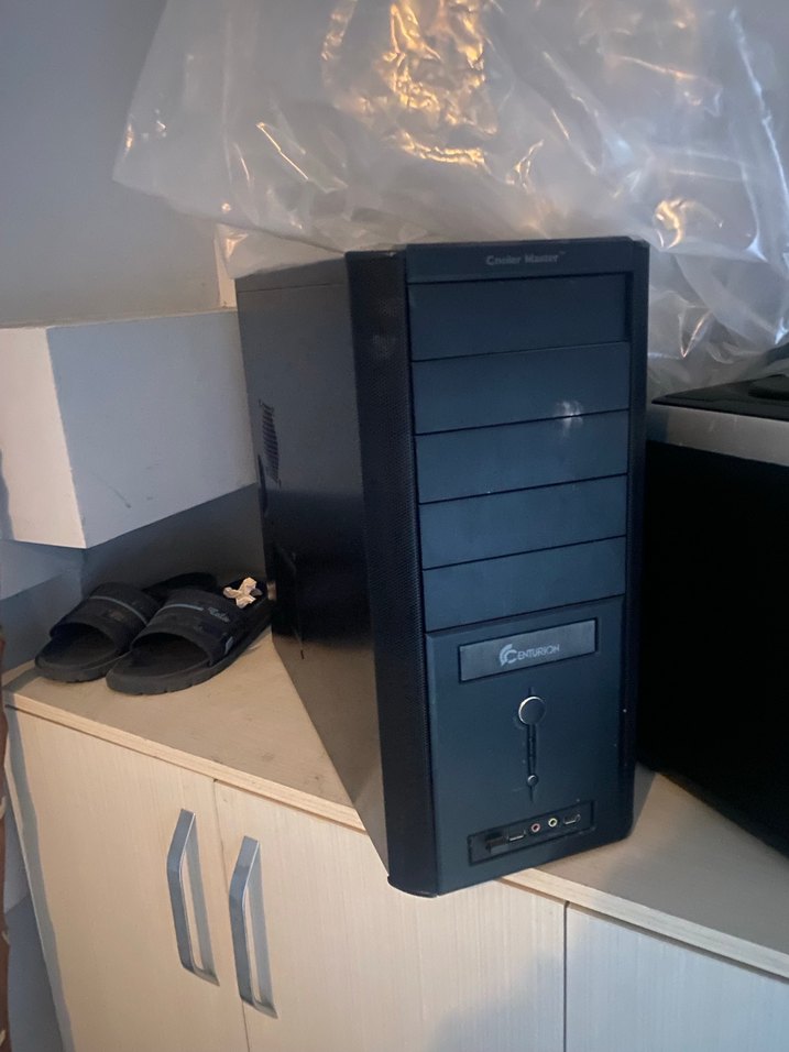 Siyah masaüstü bilgisayar kasası, ön tarafta birden fazla yuva ve altta güç düğmesi bulunur. Yan tarafında soğutma için havalandırma vardır. ️