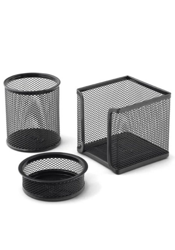 Siyah metalden yapılmış, kalemlik, notluk ve küçük eşyalar için masaüstü düzenleyici set. File desenli tasarım ile havalandırma sağlar. ️