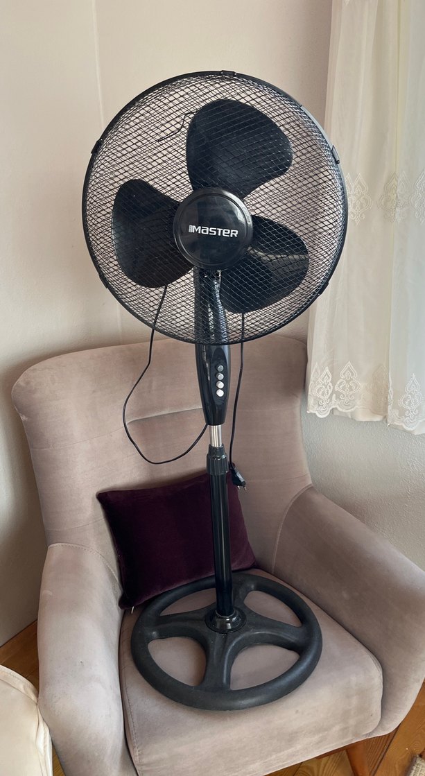 Ayarlanabilir yükseklik ve çoklu hız ayarlarına sahip siyah Master ayaklı vantilatör, sağlam taban ve koruyucu tel ızgara içerir. ️