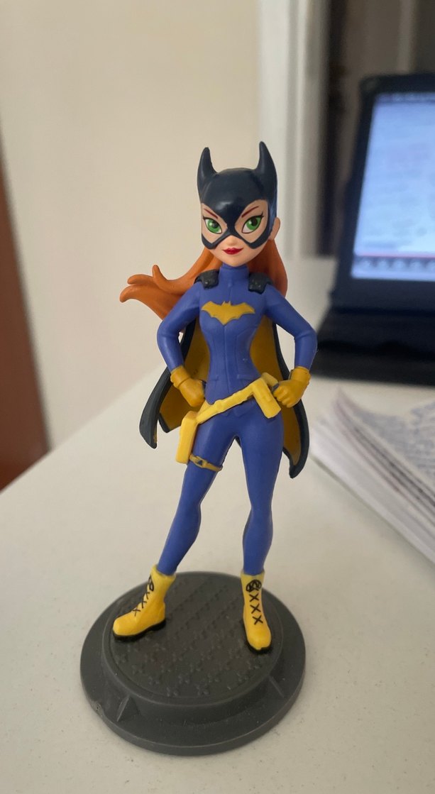Siyah mavi renkli Batgirl aksiyon figürü, detaylı kostümü ve sarı botları ile yuvarlak bir taban üzerinde duruyor.