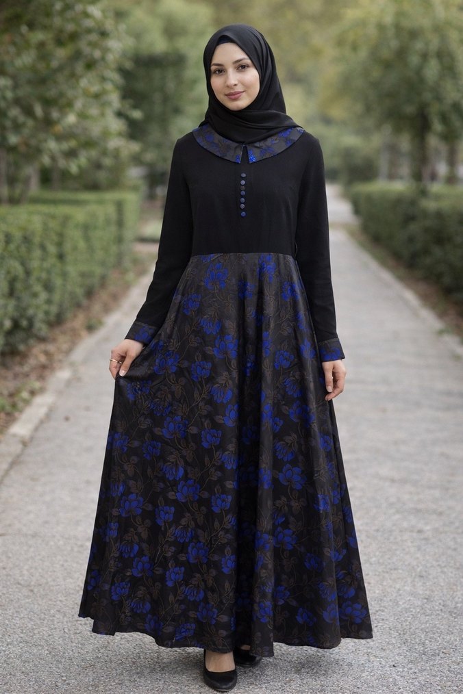 Uzun, siyah ve mavi desenli Abiye .Yüksek yakalı ve uzun kollu, dökümlü etek kısmı gotik tarzı yansıtır.