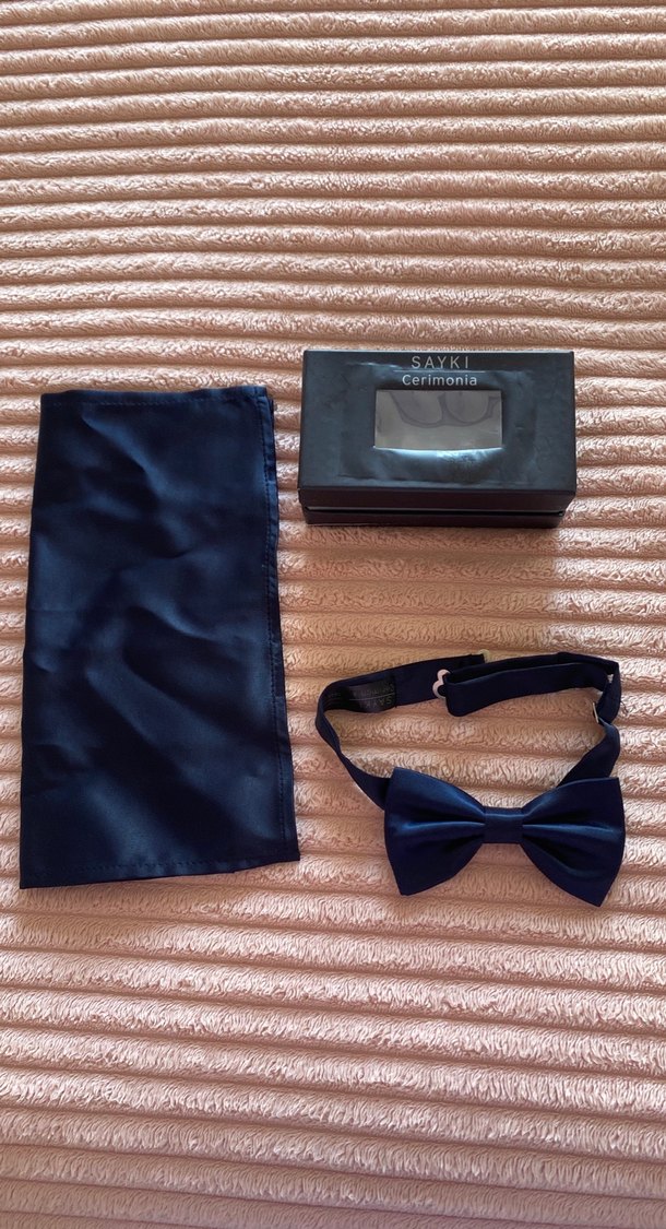 Erkekler için koyu mavi papyon (lacivert) ve uyumlu mendil seti, pürüzsüz kumaştan modern klasik tarzda. Şık ve desen içermeyen tasarım içerir. Hiç kullanılmadı kutusunda duruyor