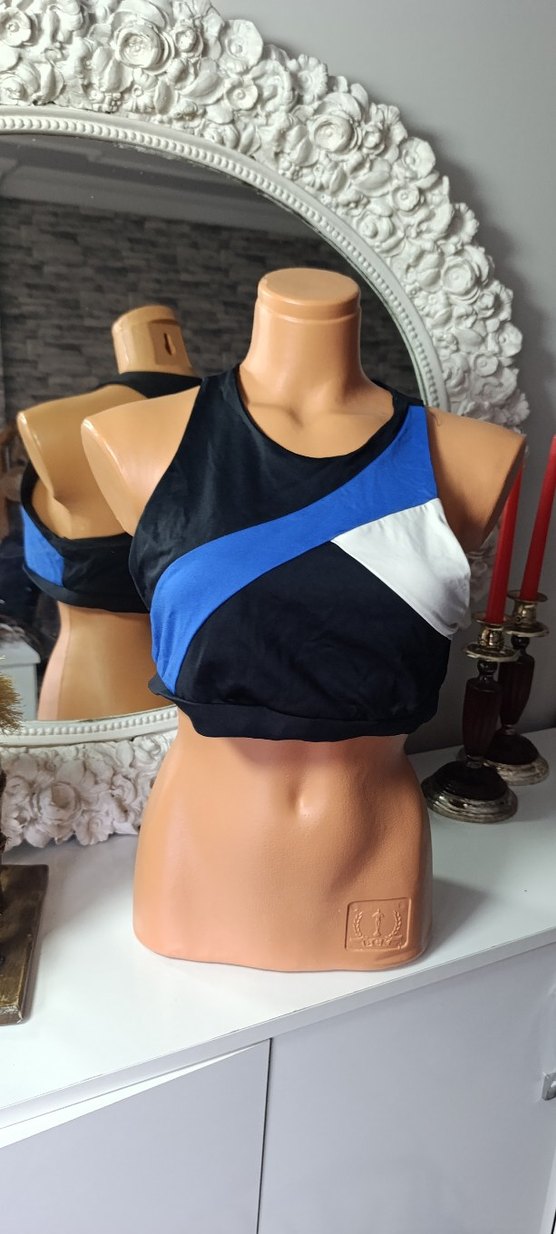 Kısa kesim, sokak tarzı spor sütyeni. Siyah zemin üzerine mavi ve beyaz çapraz panellerle şık ve sportif bir görünüm sunar. ️♀️