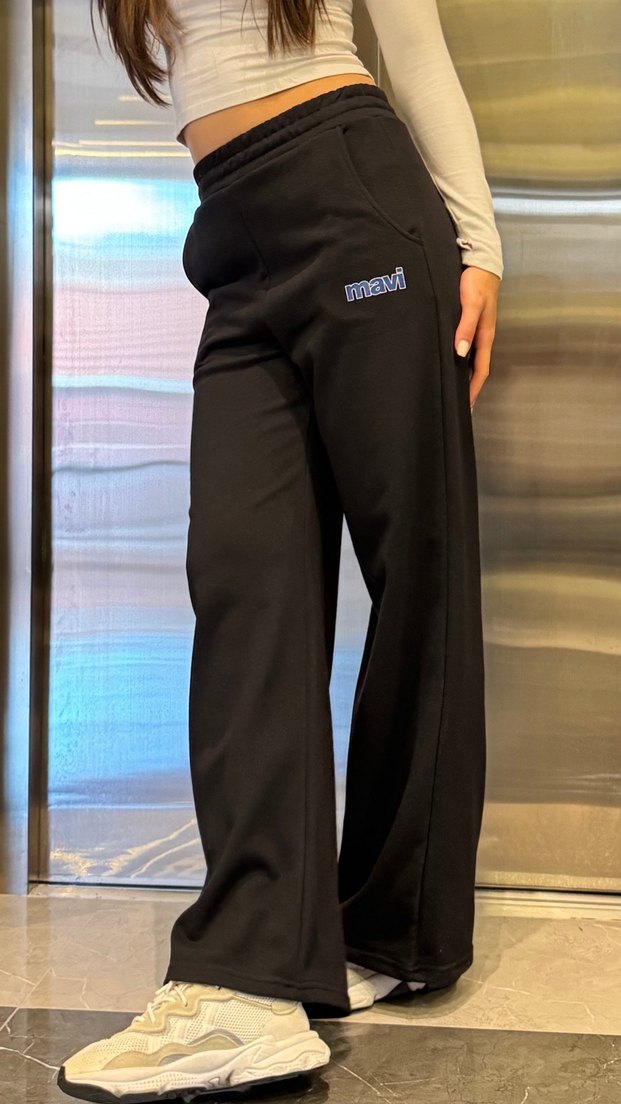 Siyah, mavi nakışlı detaylı, rahat kesim ve midi boyda kadın eşofmanı. Günlük kullanıma uygun, konforlu ve şık bir parça.