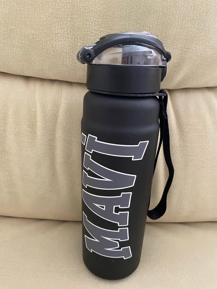 Siyah renkte, üzerinde MAVİ yazısı bulunan çocuk termosu. Üst kısmında taşıma sapı ve gri renkli askısı vardır üst kapagında catlak vardır Su akıtmıyor fotoğrafta görüldüğü gibidir