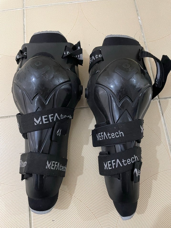 Siyah biker tarzı motosiklet diz koruyucuları, kauçuk malzeme ve ayarlanabilir Velcro bantlarla MEFAtech markalıdır. ️Görselde göründüğü gibidir
