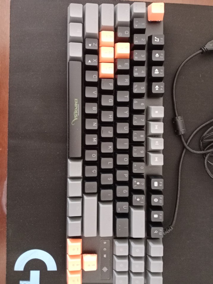 Bu siyah mekanik klavye, turuncu vurgulu tuşlara sahip ve kablo ile bağlanıyor. Yedek tuşları, temizleme aparatları, kullanma kılavuzu dahilindedir. Bilgisayarım bozulmadan önce daldım sadece bir kez kullanabildim. RGB ışık aydınlatmalı. Ben bir kere kullandım çok memnun kaldım. Sıfır ürün bütün herşeyiyle birlikte gönderilecektir. Alıcısına şimdiden hayırlı olsun. Ürünün pazarlık payı vardır. ⌨️