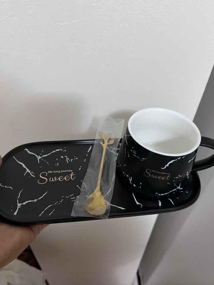 Mermer desenli siyah fincan ve tabak seti, altın renk kaşık ile birlikte. Üzerinde 'Sweet life-long journey' yazısı bulunur. ☕ 3 Adet mevcut