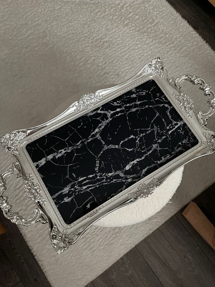 Siyah mermer desenli yüzeye sahip, süslü saplı gümüş tepsi, şıklık ve kullanım kolaylığı sunar. ️