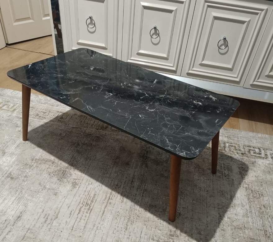 Siyah renkte, mermer desenli ve modern tarzda sehpa.