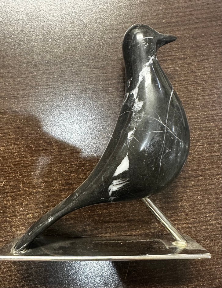 Doğal beyaz damarlarıyla mermerden yapılmış siyah kuş figürü, metal kaide üzerinde duruyor.