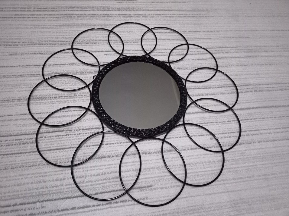 Bu dekoratif ayna, siyah metal çerçeve ve etrafında dairesel halkalar ile modern bir görünüm sağlar. Herhangi bir sorunu sadece bazı yerlerinde renk farklılıkları vardır