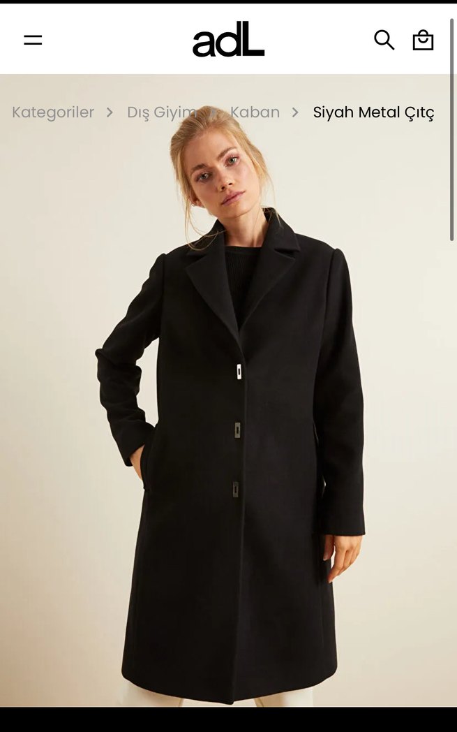Siyah metal çıtçıt düğmeli, klasik yakalı ve uzun kollu şık kaban.