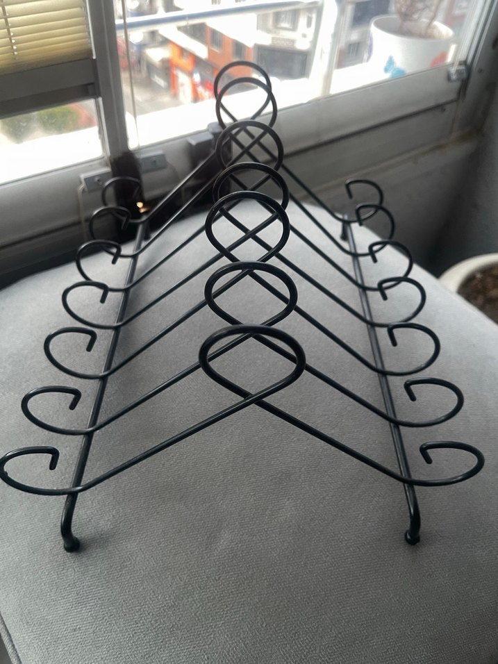Siyah metalden yapılmış, üçgen şeklinde çoklu askı kancaları bulunan pratik bir askılıktır.