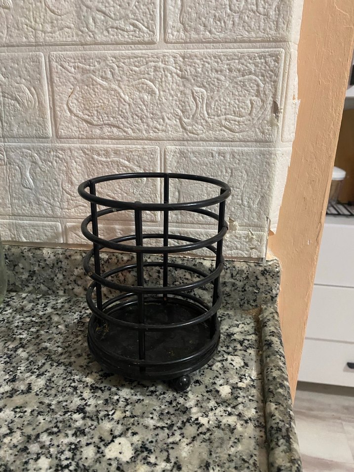 Siyah metalden yapılmış, açık çubuklu ve sağlam tabanlı yuvarlak çatal kaşık tutucu.