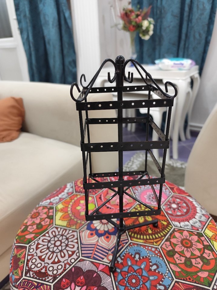 Siyah metalden yapılmış, dekoratif üst kısmı ve çoklu bölmeleri olan makyaj organizeri. dönebilir