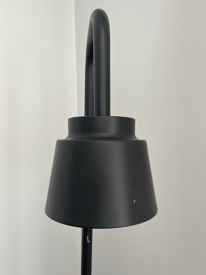 Siyah metalden yapılmış, kavisli saplı ve konik gövdeli masa lambasıdır. Sadece altı ay salonda durdu hiç bir deformesi yok.