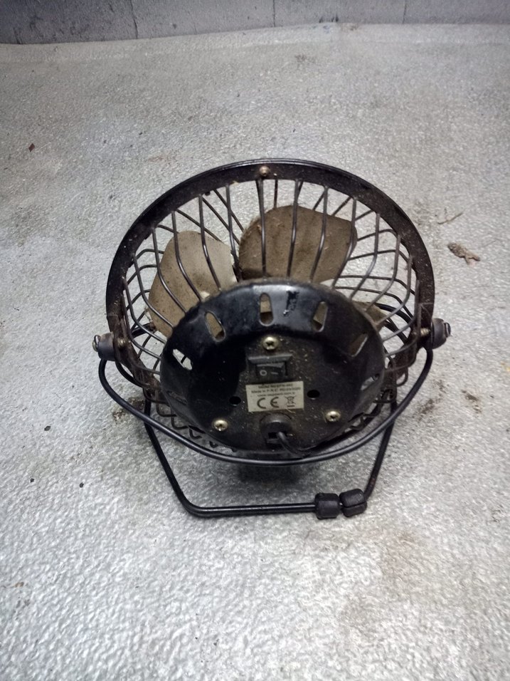 Küçük masaüstü vantilatör, siyah metal gövde ve koruyucu ızgara ile gri kanatlara sahiptir. Ayarlanabilir standı ile yönlendirilebilir hava akışı sağlar.