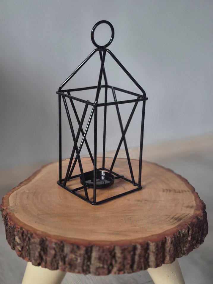 Tek mumluk tutan, üstte halka kulplu siyah metal geometrik tasarımlı mumluk. ️