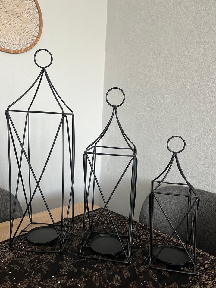 Geometrik tasarımlı, farklı boyutlarda siyah metal mumluk seti. Üstte halka tutacağı bulunur. ️