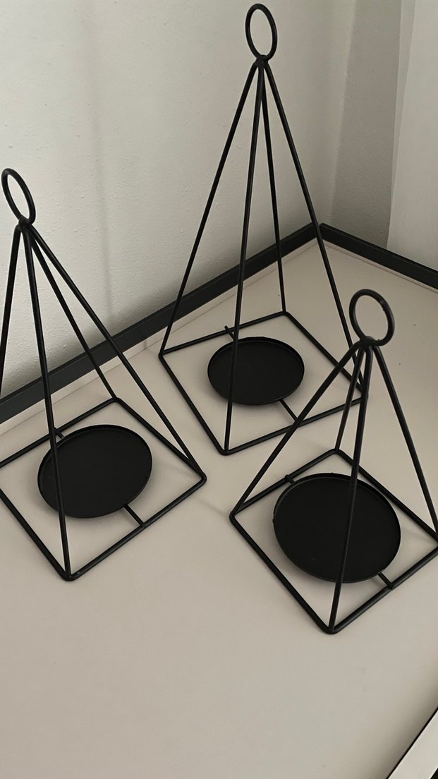 Geometrik piramit tasarımlı, siyah metalden üçlü mumluk seti. Her mumlukta yuvarlak taban ve üstte halka kulp bulunur. ️