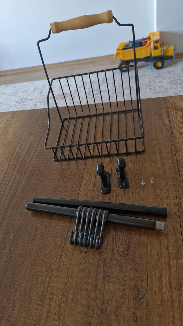 Siyah metal mutfak askılık seti, tel sepet, kancalar ve çubuklar içerir. Dayanıklı ve yer tasarruflu tasarım. tertemiz sıkıntısız Ürün.