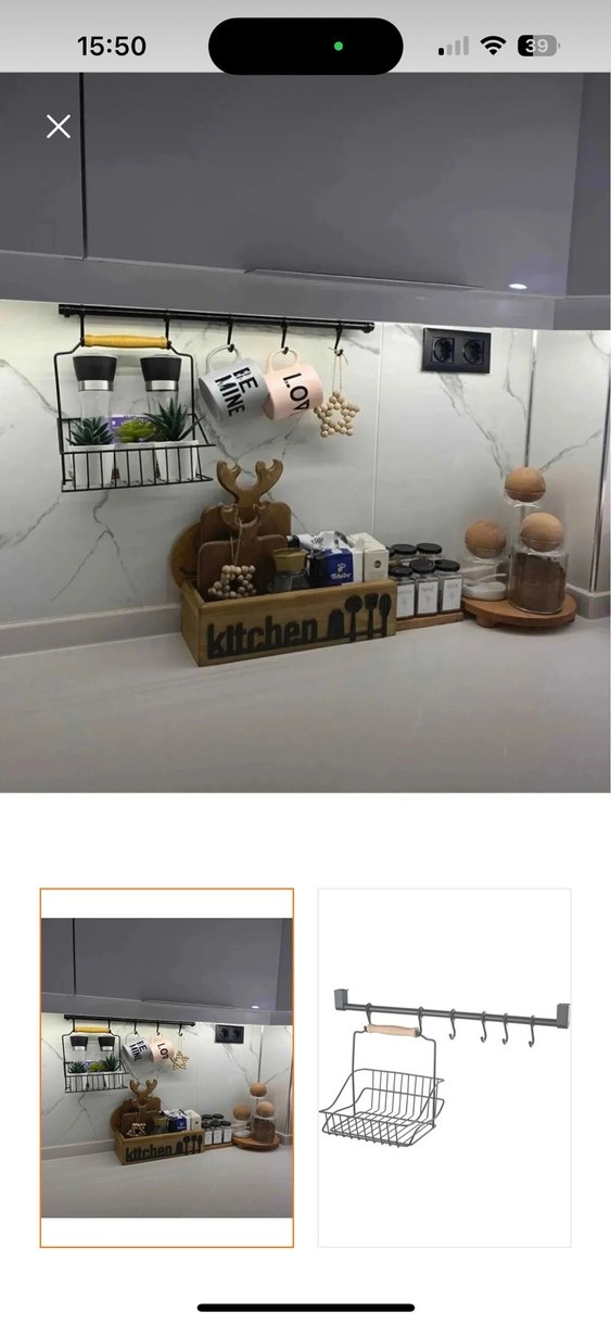 Siyah metal mutfak rafı, askılar ve sepet ile mutfak eşyalarını ve baharatları düzenlemek için kullanılır.