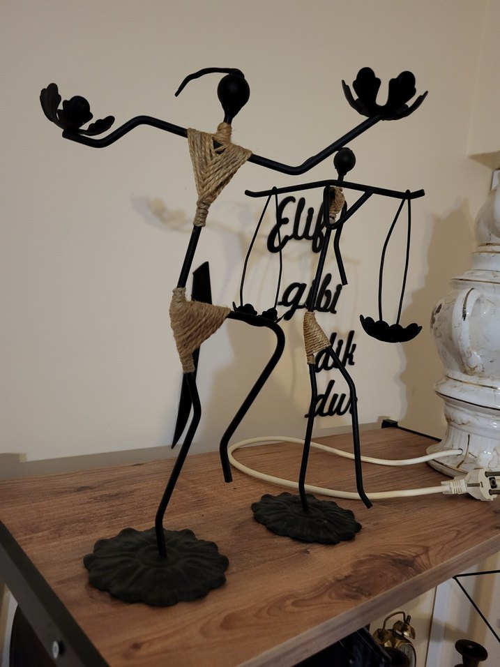Örgü detaylı siyah metal figürin, soyut insan formunda ve dinamik pozisyonda. Dokulu taban üzerinde duran modern tasarım. mumluk 2 adet