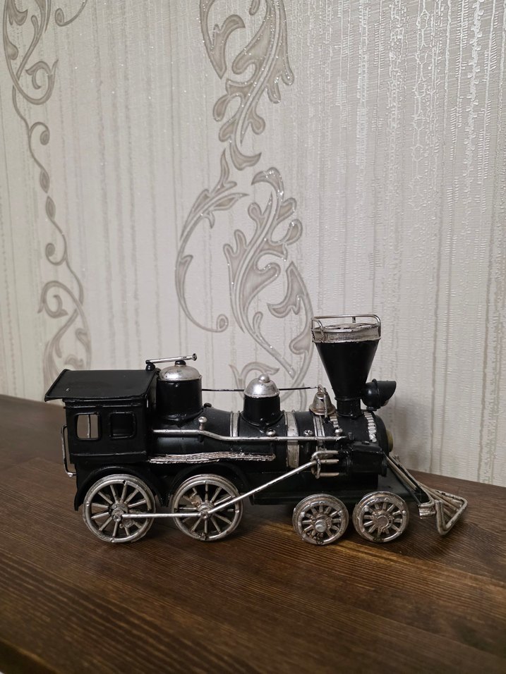 Detaylı tekerlekler ve bacası olan siyah metal oyuncak tren modeli. Nostaljik tasarımıyla koleksiyoncular için uygun.