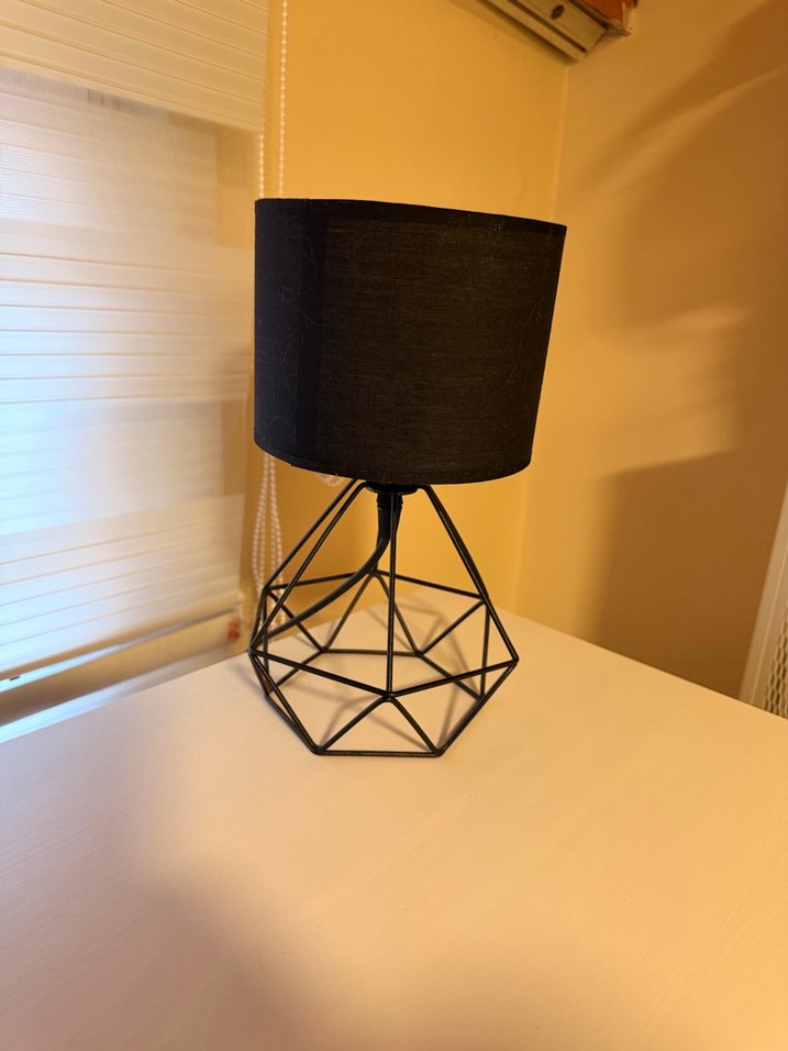 Geometrik metal taban ve siyah kumaş abajurdan oluşan modern ve şık siyah lamba. ️