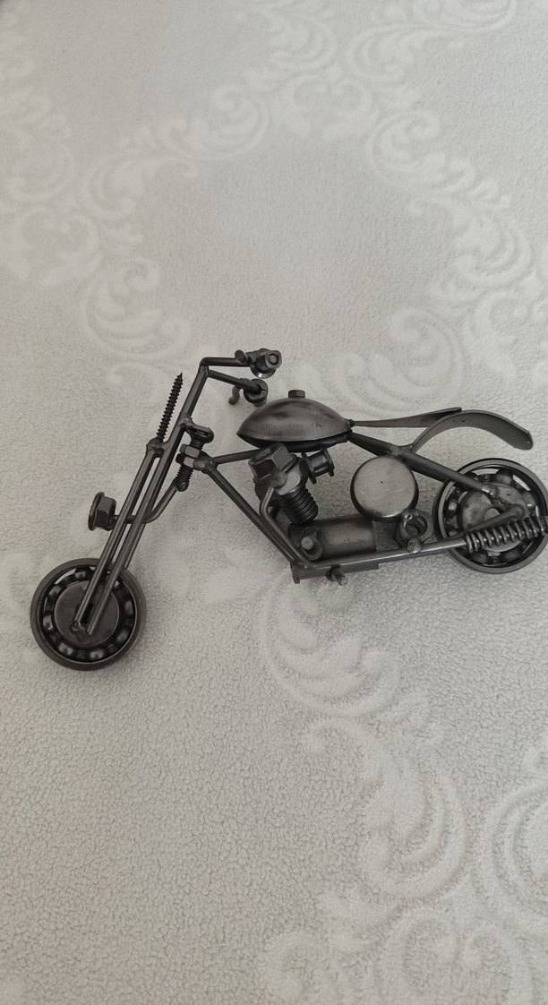 Detaylı çerçeve ve tekerleklere sahip siyah metal motosiklet tarzında üç tekerlekli model. Koyu renkte dekoratif ürün. ️
