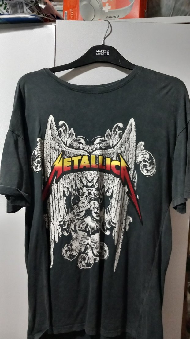 Sokak stiline uygun, metallica baskılı desene sahip siyah tişört, bol kesim ve orta boyda. Beden M (EU, ABD, MEX).