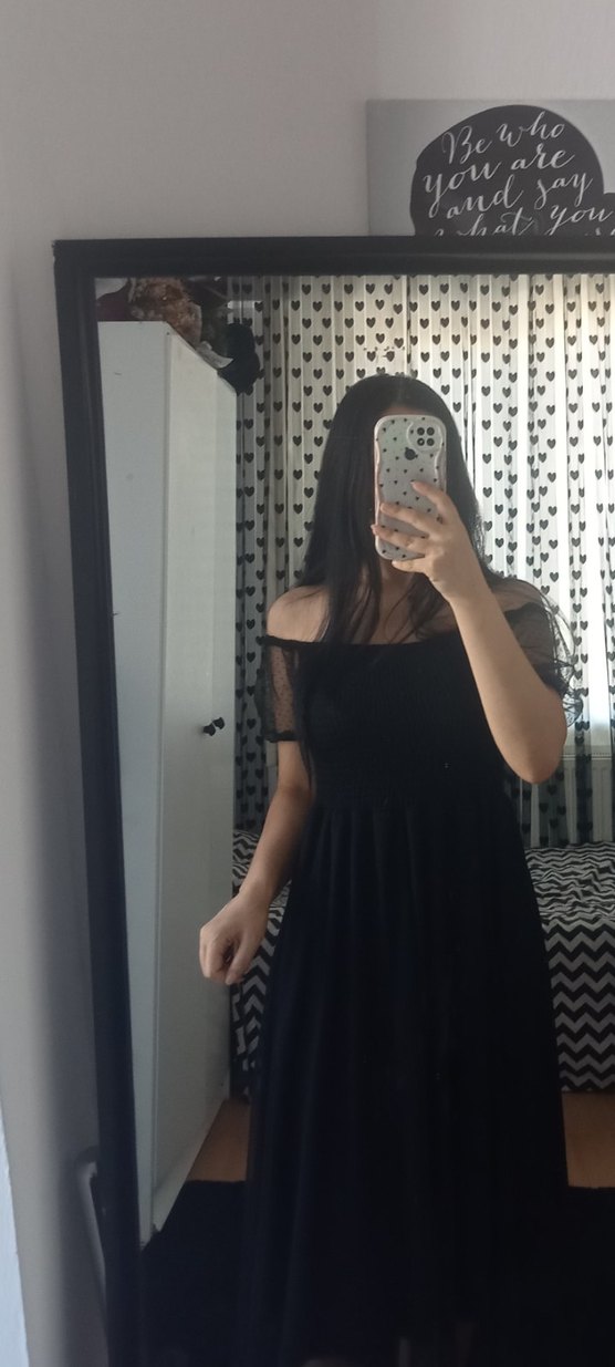 Siyah, straplez yaka ve transparan askılı kollara sahip, eteği tül Baya güzel bir elbise bir kez giyildi hiçbir kusuru yok