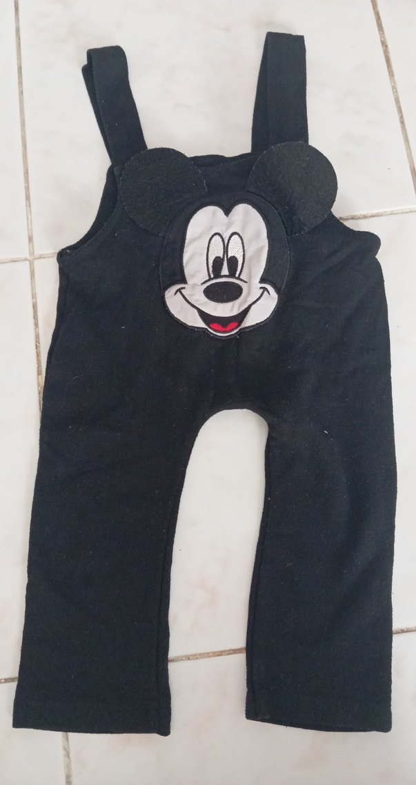 Yumuşak kumaştan yapılmış, siyah, baskılı Mickey Mouse figürlü, askılı çocuk tulumu. marka temsilidir