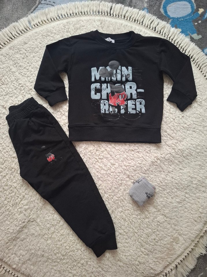 tertemiz ürün az süre kullanıldı 5 yaş uyumlu çorap hediyem Siyah renkli, Mickey baskılı, bol kesim erkek çocuk eşofman takımı. Yumuşak dokulu kumaştan, bisiklet yaka ve zincir detaylıdır.