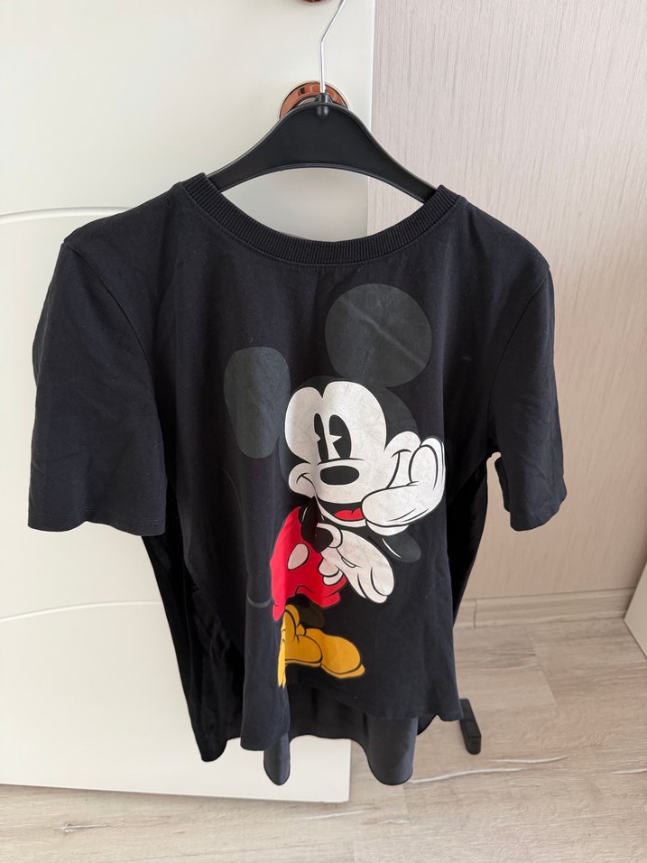 Siyah pamuklu tişörtü, bol kesim ve yuvarlak yaka. Mickey Mouse baskılı, kısa kollu, günlük rahat kullanım için uygundur.