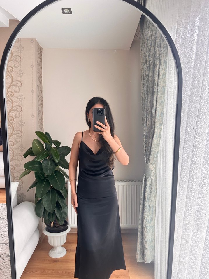 Siyah midi elbise, v-yaka ve askılı kollara sahip, vücuda oturan kesimiyle dikkat çeker. İpeksi kumaştan üretilmiş, romantik akşamlar için şık ve sade bir tercih.