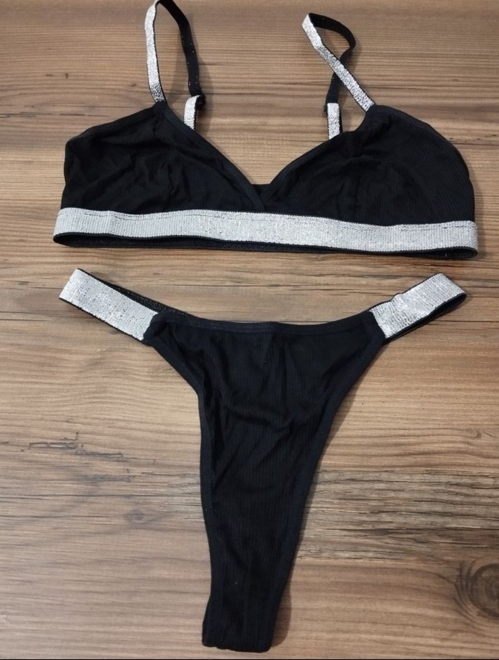 Gümüş elastik askı ve bant detaylı, normal boy midi siyah atletik kadın iç giyim takımı. Rahat ve sade tasarım, streetwear tarzı için uygun. S-M bedenleri mevcuttur
